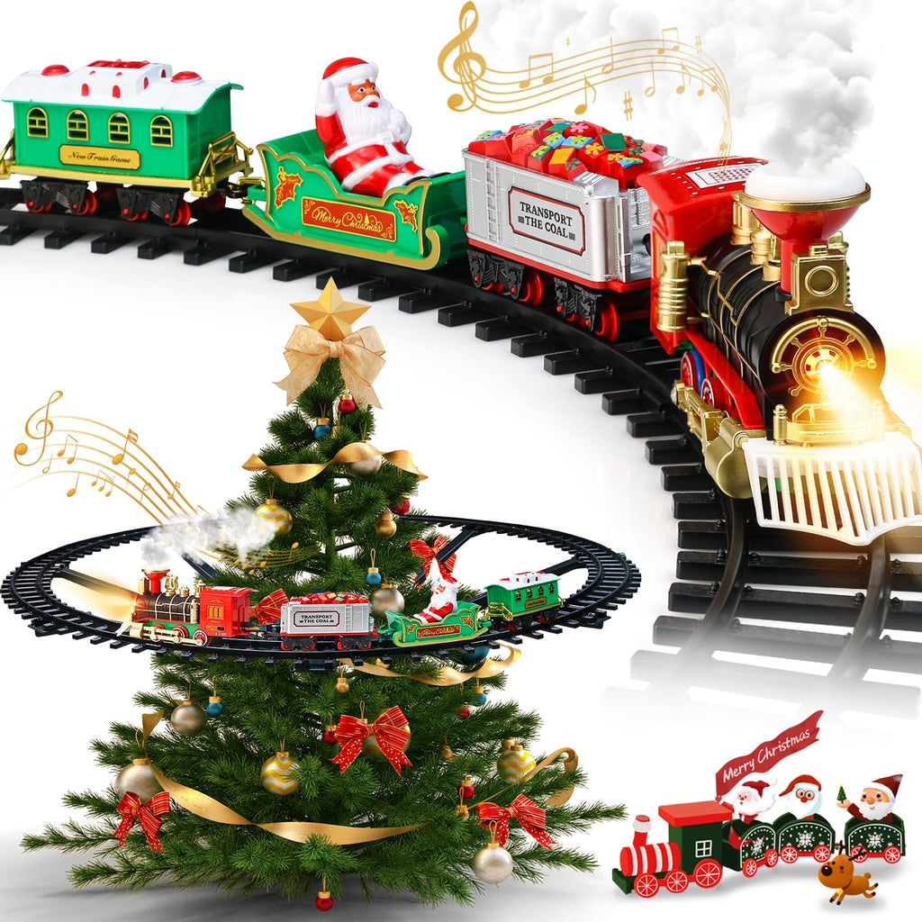 This Christmas Train Set Around Tree Smoke Lights transforms your holiday décor into an interactive experience. Designed as a versatile Christmas train set, it runs smoothly around the base or middle of a tree using included support brackets or lays flat as a traditional ground track for two types of play. The set features realistic whistle sounds, bright LED lights and a harmless water-powered smoke effect that adds cinematic charm without odors. Easy DIY assembly and upgraded double-lock track pieces let kids and parents create stable circular or custom layouts to boost creativity and hand-eye coordination. Built from durable, non-toxic ABS with strict quality control, this train set is safe for children aged 3 and up and makes an ideal Christmas or birthday gift. With plug-and-play operation and multiple gears or modes depending on model, the Christmas train set delivers long hours of festive entertainment and family bonding while enhancing imaginative play and holiday atmosphere.