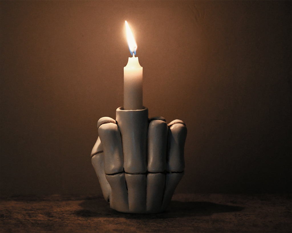 - Gothic Gifts - This skull middle finger candlesticks makes for a humorous and creative gift idea for birthdays, candlelit dinners, dining rooms, living rooms, parlors, studies, and bars. It's an excellent choice for celebrations, creating ambiance, housewarming gifts, and special occasions